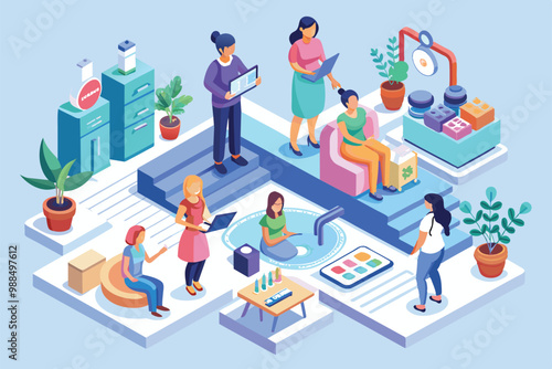 Diverse characters engage in various activities representing different pregnancy stages in a colorful, inviting environment filled with plants and objects.