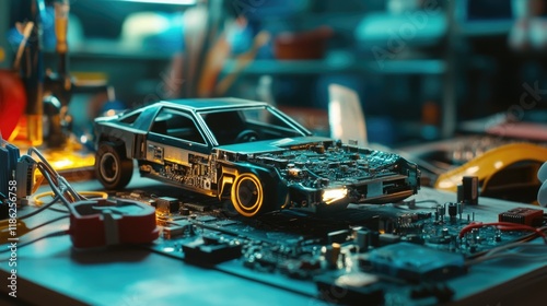 Diverse children engaged in hands-on learning with digital electronic tools and a robotic car model on a workshop table surrounded by wires and equipment
