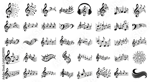 Diverse Collection of Black and White Musical Notes and Symbols, Elegant Graphic Elements for Design Projects, Creative Audio Concepts and Visual Art Illustrations