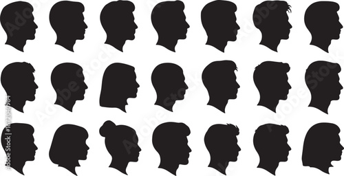 Diverse collection of black silhouettes showcasing various human head profiles and hairstyles