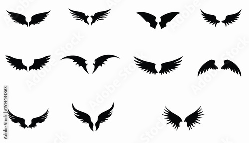 Diverse Collection of Black Wing Silhouette Vector Graphics on White Background for Design.