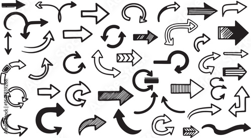 Diverse collection of hand-drawn black and white arrow icons on a white background