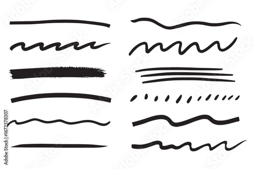 Diverse collection of hand-drawn black ink lines, squiggles, and brush strokes, offering versatile graphic elements for creative design and emphasis in projects