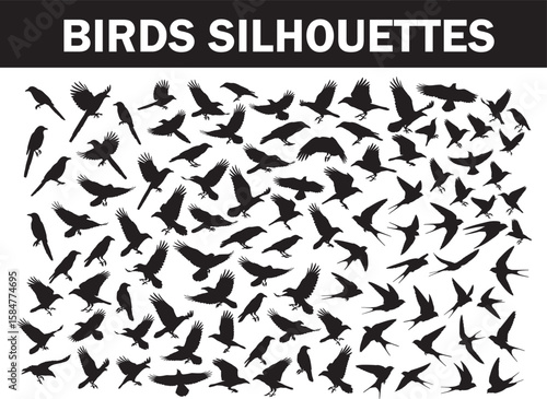 Diverse collection of various flying bird silhouettes in dynamic poses, perfect for nature-themed designs, abstract backgrounds, and ornithological illustrations with motion
