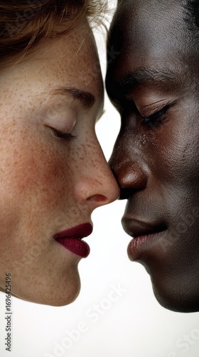 Diverse couple expressing intimacy and connection with closed eyes and touching noses in soft lighting