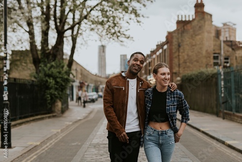 Diverse couple on a date, walking in the city