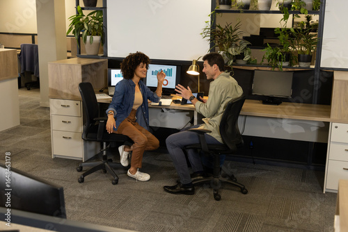 Diverse coworkers discussing data on monitors in open-plan office, sitting on rolling chairs