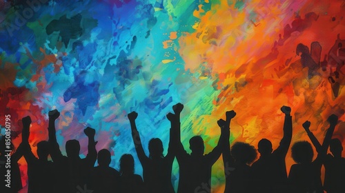 diverse crowd of protestors raising hands in unity silhouettes against vibrant sky digital painting