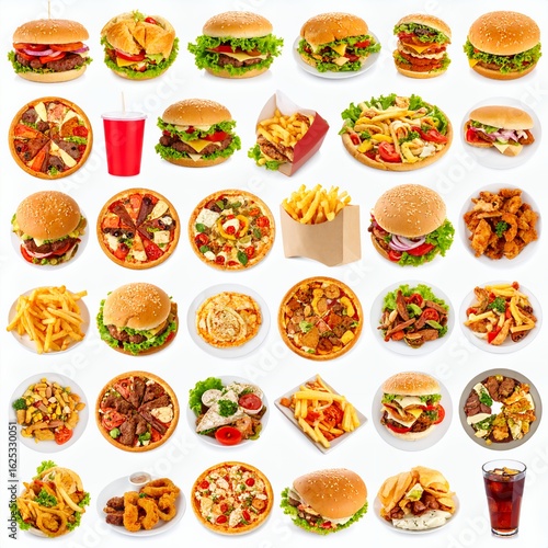 Diverse culinary assortment showcasing burgers, pizzas, fries, and salads arranged appealingly on white background