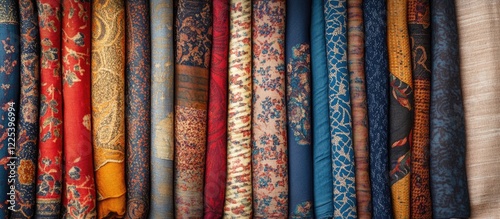 Diverse fabric samples in vibrant hues arranged vertically showcasing rich textures and patterns with ample copyspace for text in a serene setting