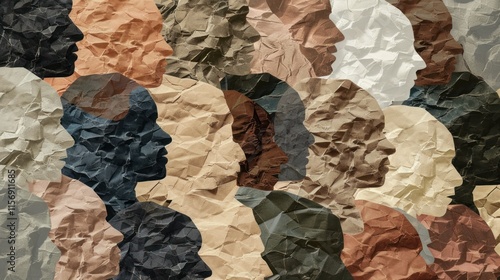 Diverse faces depicted on crumpled paper, symbolizing unity and equality.