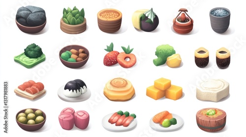 Diverse food icons Asian cuisine ingredients, dishes, and desserts; website, app, or cookbook illustration