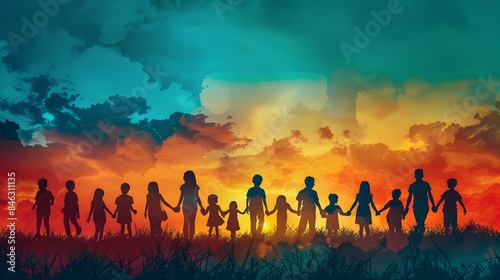 Diverse Friends Silhouetted Against Vibrant Gradient Sunset Sky