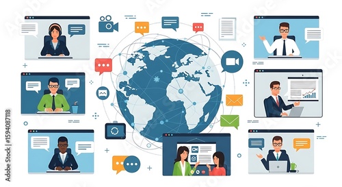 Diverse global team engaged in virtual communication.