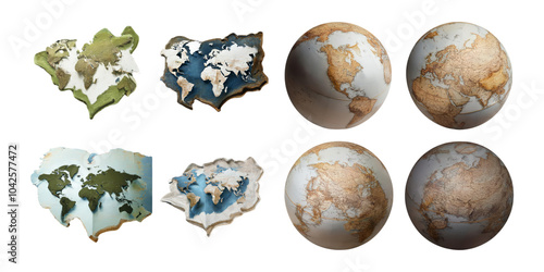 Diverse Globes and Maps of the World, PNG collection, set bundle, isolate on transparent or white background