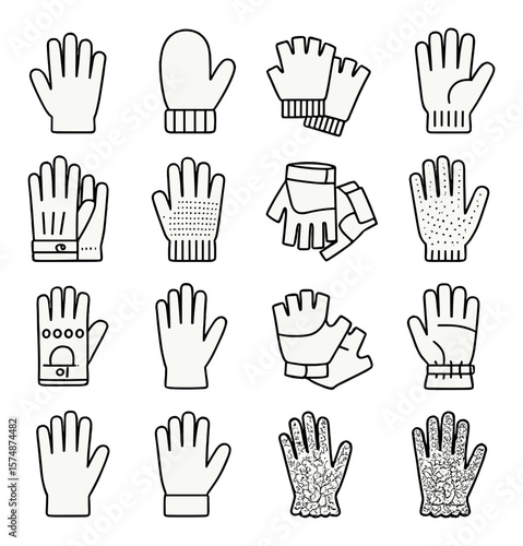 Diverse glove icon collection, handwear graphics. mittens, gloves, and accessories set