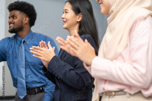 Diverse group business in formal attire smiling and clapping during a corporate meeting, celebrating success and achievements, diverse workplace environment with professional women engaged in teamwork