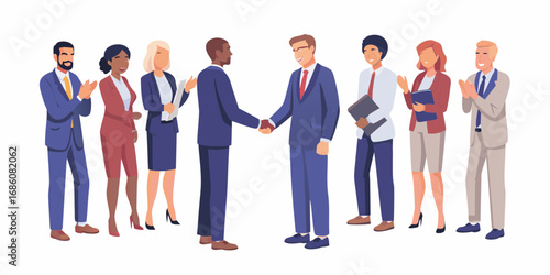 Diverse group of business professionals in suits and formal attire celebrating a successful handshake deal