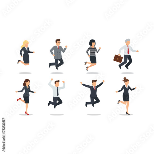 Diverse Group of Business Professionals Joyfully Jumping in Celebration and Success, Dynamic Flat Illustrations