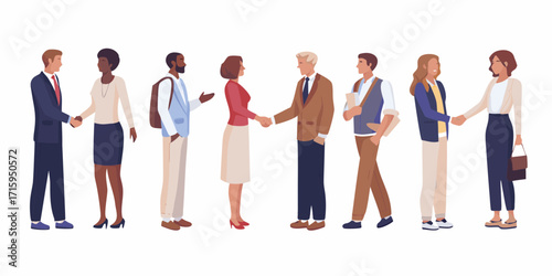 Diverse group of business professionals shaking hands and collaborating in a modern office setting