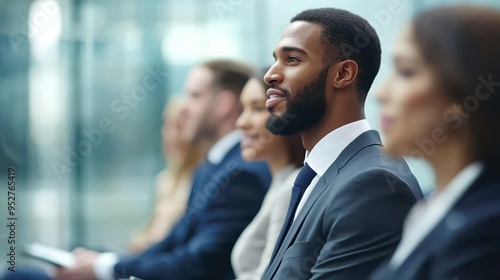 Diverse Group of Candidates Waiting in Modern Office Lobby Professional Attire Happy Suit