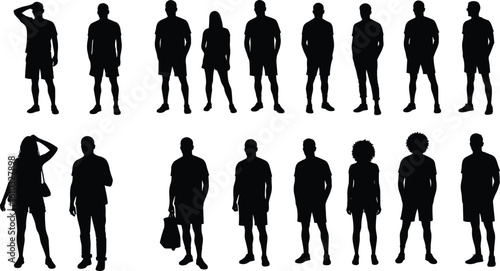 Diverse group of casual summer attire silhouettes, featuring various men and women standing in relaxed poses, perfect for themes of recreation, holidays, and everyday urban or outdoor scenes.