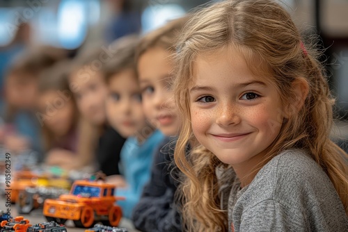 diverse group of children engaged in a robotics project collaborating on ai toys bright classroom setting with futuristic tech elements and excited expressions