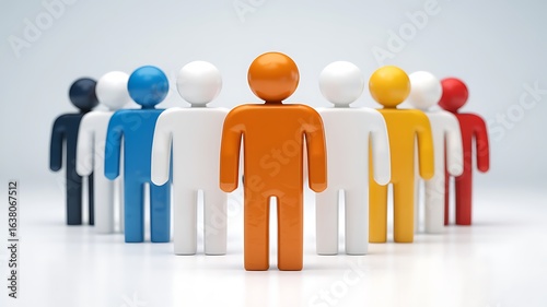 Diverse group of colorful plastic figures standing together in a line with an orange leader in front representing teamwork and unity