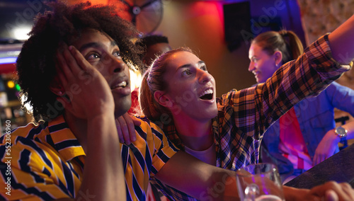 Diverse group of excited male and female friends watching sports game showing at a bar