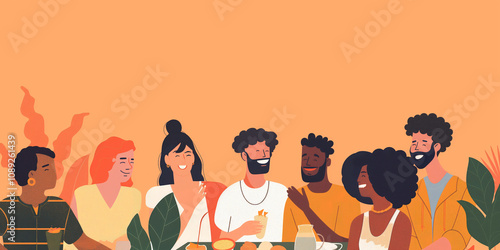 Diverse group of friends enjoying a meal together in a warm and cheerful setting, representing community, connection, and multicultural unity, banner, bright orange background
