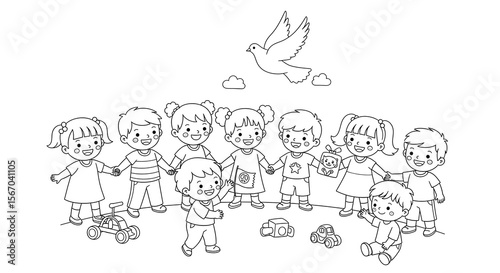 Diverse group of happy children holding hands with toys and a dove isolated on transparent background