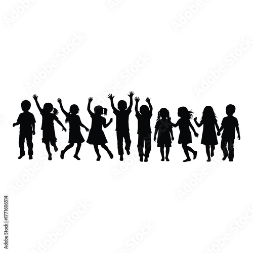Diverse group of happy children silhouettes dancing and jumping joyfully celebrating childhood fun and freedom silhouette