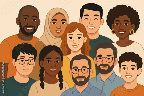 Diverse group of happy multiethnic and multiracial people. Concept of a global community, multicultural society, inclusion, and unity. Vector cartoon illustration of a friendly crowd.