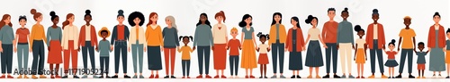 Diverse group of mothers, children stand together holding hands. Family unity, love. Different ethnicities. Illustration highlights international mother day celebration. Various ages, styles. Modern