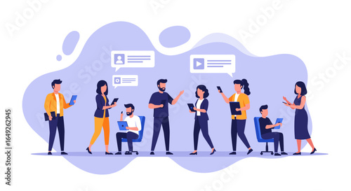 Diverse group of people communicating and working together using mobile devices and laptops in a modern office setting.