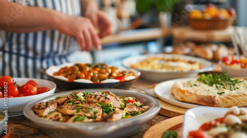 Diverse group of people enjoying a shared cultural dining experience with a depth of field showcasing the delicious food table setting and cozy atmosphere