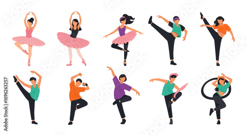 Diverse group of people performing various dance styles, from ballet to hip-hop.