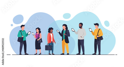Diverse group of people using smartphones, ideal for website banners, app interfaces, and social media posts.