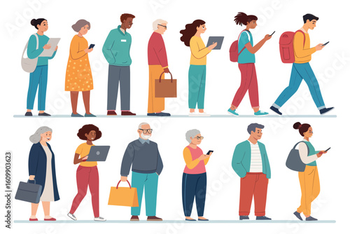 Diverse group of people walking and standing, using technology, showcasing modern lifestyle in a minimalist artistic style.