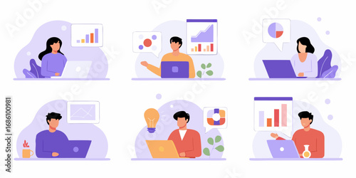 Diverse group of people working on laptops with data charts and graphs illustrating business growth and ideas