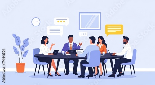 Diverse group of professionals collaborating and discussing ideas around a conference table in a modern meeting room