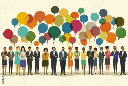 Diverse group of professionals communicating, showcasing vibrant speech bubbles in various colors, representing collaboration and teamwork in a modern business environment