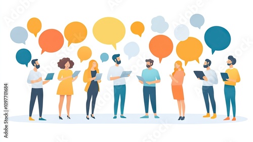 Diverse group of professionals engaged in conversation, holding tablets amidst colorful speech bubbles.