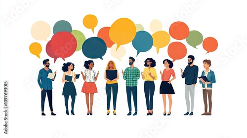 Diverse group of professionals engaging in a lively discussion with colorful speech bubbles overhead.