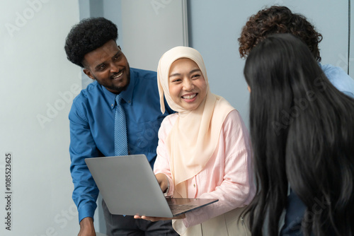 Diverse group of professionals smiling and discussing ideas while working together on a laptop in a modern office setting.