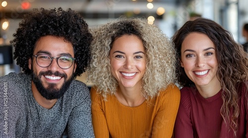 Diverse group of smiling colleagues in a modern office. Possible use teamwork, business, or friendship