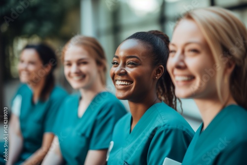 diverse group of smiling female nurses at training at college