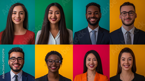 Diverse group of smiling professionals in formal attire against vibrant colored backgrounds, showcasing confidence and personality.