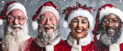 Diverse Group of Smiling Santa Clauses in Festive Attire with Snowfall. Concept of Christmas Celebrations, Holiday Spirit, Joyful Gatherings, Seasonal Festivities, Multicultural Unity. Banner