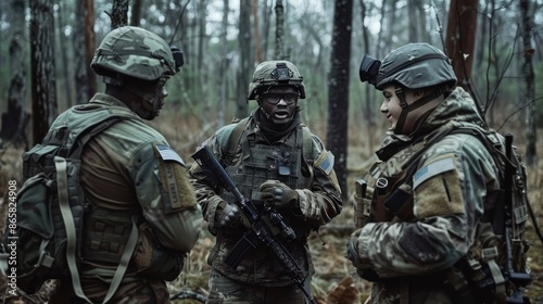 Diverse group of soldiers planning their next move in dense forest. Military squad discussing strategy during tactical operation.